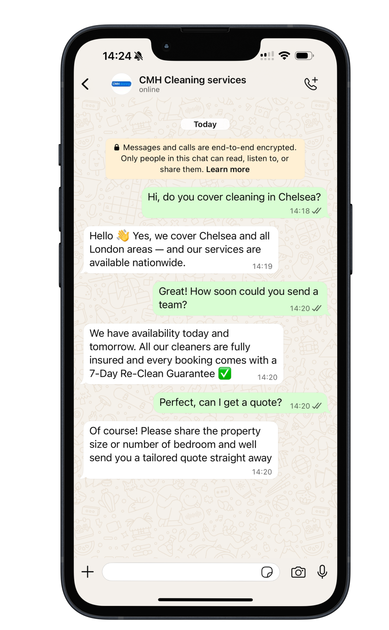 Receive your tailored cleaning quote instantly through WhatsApp or our booking form. No delays, no hassle – just clear, upfront pricing with our 7-Day Re-Clean Guarantee.